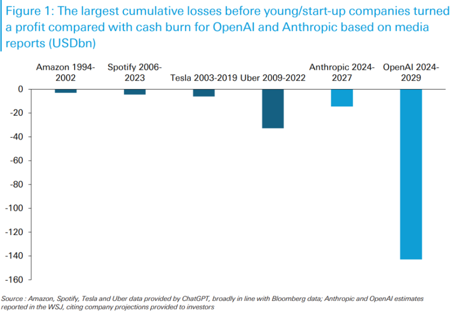 图表数据显示,亚马逊(1994-2002 年)、Spotify(2006-2023 年)、特斯拉(2003-2019 年)和 Uber(2009-2022 年)在实现盈利前的累计亏损额,与 OpenAI(2024-2029 年)预计的 1430 亿美元以及 Anthropic(2024-2027 年)的预期亏损相比,都显得相形见绌。