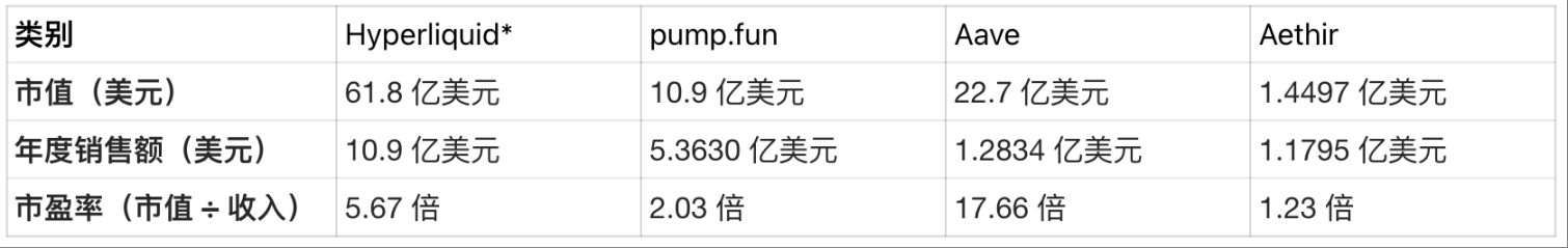 我们可以通过 Hyperliquid、Pump.fun 等主要盈利项目的市盈率(PER)来判断其价值。市盈率的计算方式为「市值 ÷ 年收入」,该指标可反映项目估值相对于实际收入是否合理。