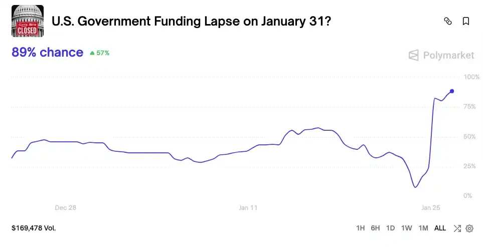 美国政府又一次走到了关门边缘。由于明尼苏达州再度发生联邦执法人员开枪致死事件,民主党参议员集体反对包含国土安全部经费的拨款方案,导致 Polymarket 1 月 30 日的停摆风险飙升至 80%。