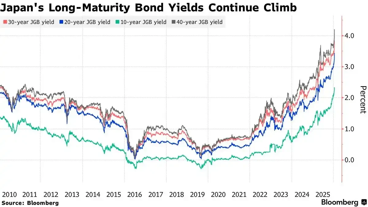 但现在,日本央行开始加息(2025 年 12 月上调至 0.75%),新任首相高市早苗又宣布终结财政紧缩,计划大规模投资和减税。这引发了市场对日本财政状况的严重担忧,导致国债被抛售,收益率飙升。